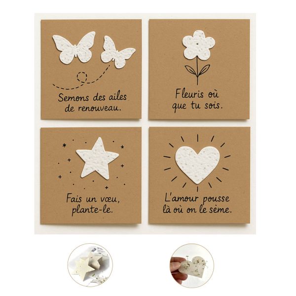- Concept Éco-Responsable : Carte en papier kraft recyclé accompagnée d’une forme en papier ensemencé 3D prête à planter.
