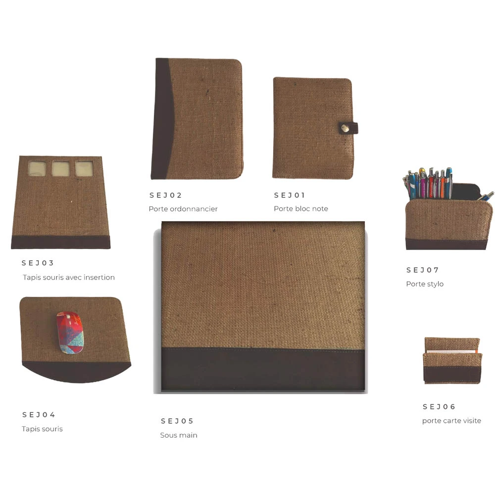 Ensemble de 7 accessoires de bureau en jute et similicuir.